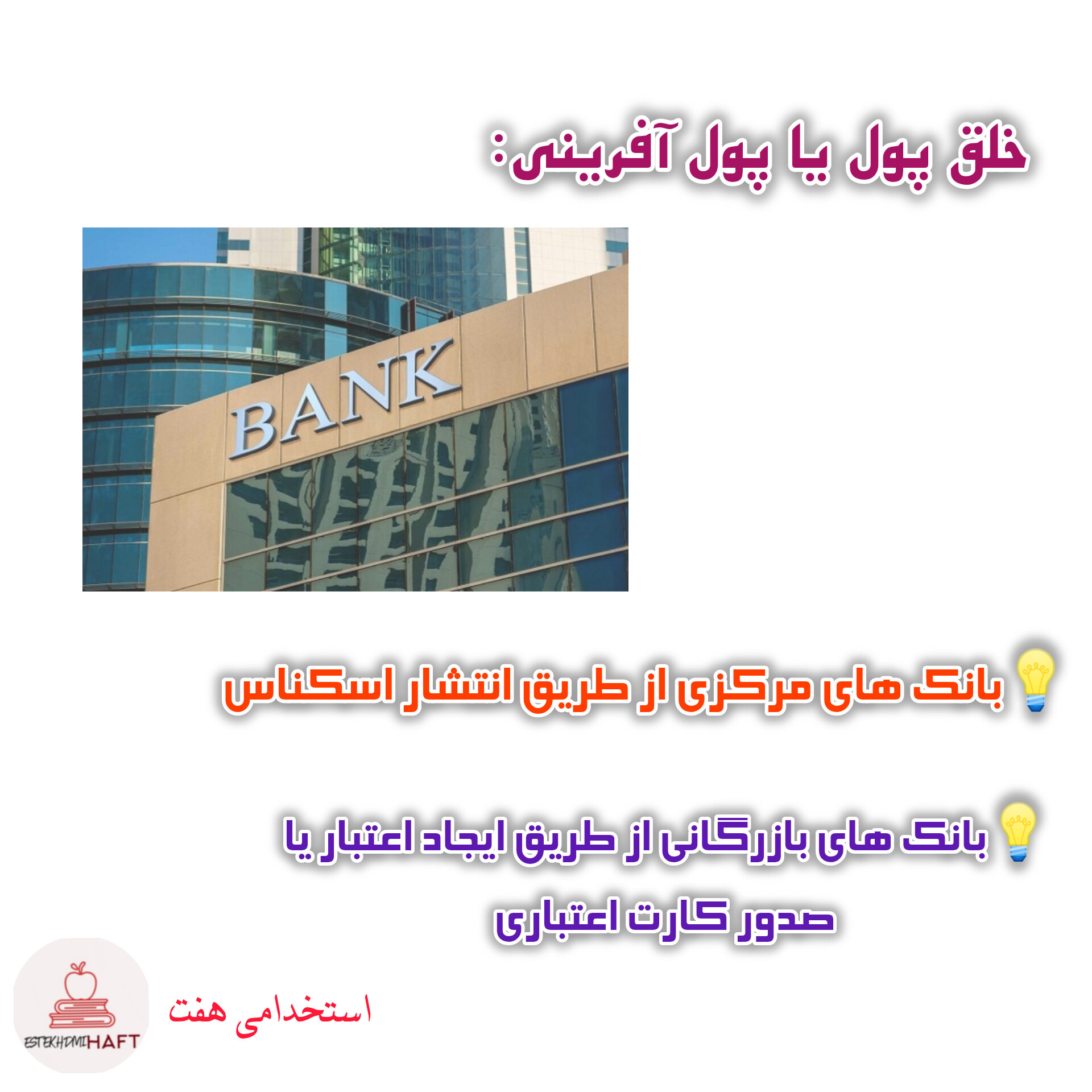 2-بانک های بازرگانی نیز همچون بانک های مرکزی ناشر اسکناس می توانند پول ایجاد کنند. پول آفرینی بانک های بازرگانی از طریق ایجاد اعتبارات می باشد.صدور کارت های اعتباری نیز به نوبه خود یک نوع پول آفرینی محسوب می شود.