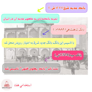 3-بانکداری به مفهوم جدید آن در ایران با تأسیس بانک جدید شرق در سال ۱۸۸۷ میلادی (۱۲۶۶ شمسی) تجربه شد. این بانک با تشکیل بانک شاهنشاهی ایران در سال ۱۸۸۹ میلادی به امتیاز بارون رویتر منحل شد. روس ها نیز در سال ۱۸۹۰ میلادی امتیاز تأسیس بانکی با عنوان بانک استقراضی ایران را به دست آوردند که پس از انحلال در بانک کشاورزی ادغام شد.